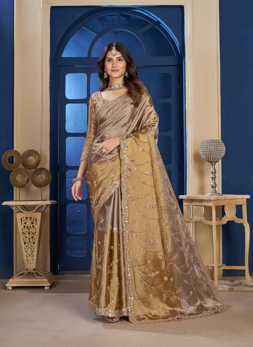 Festive Wear Gold Saree with Delicate Thread & Sequin Embellishments